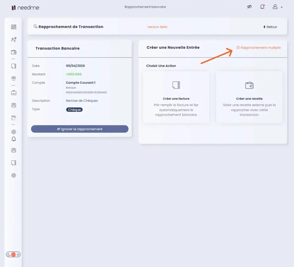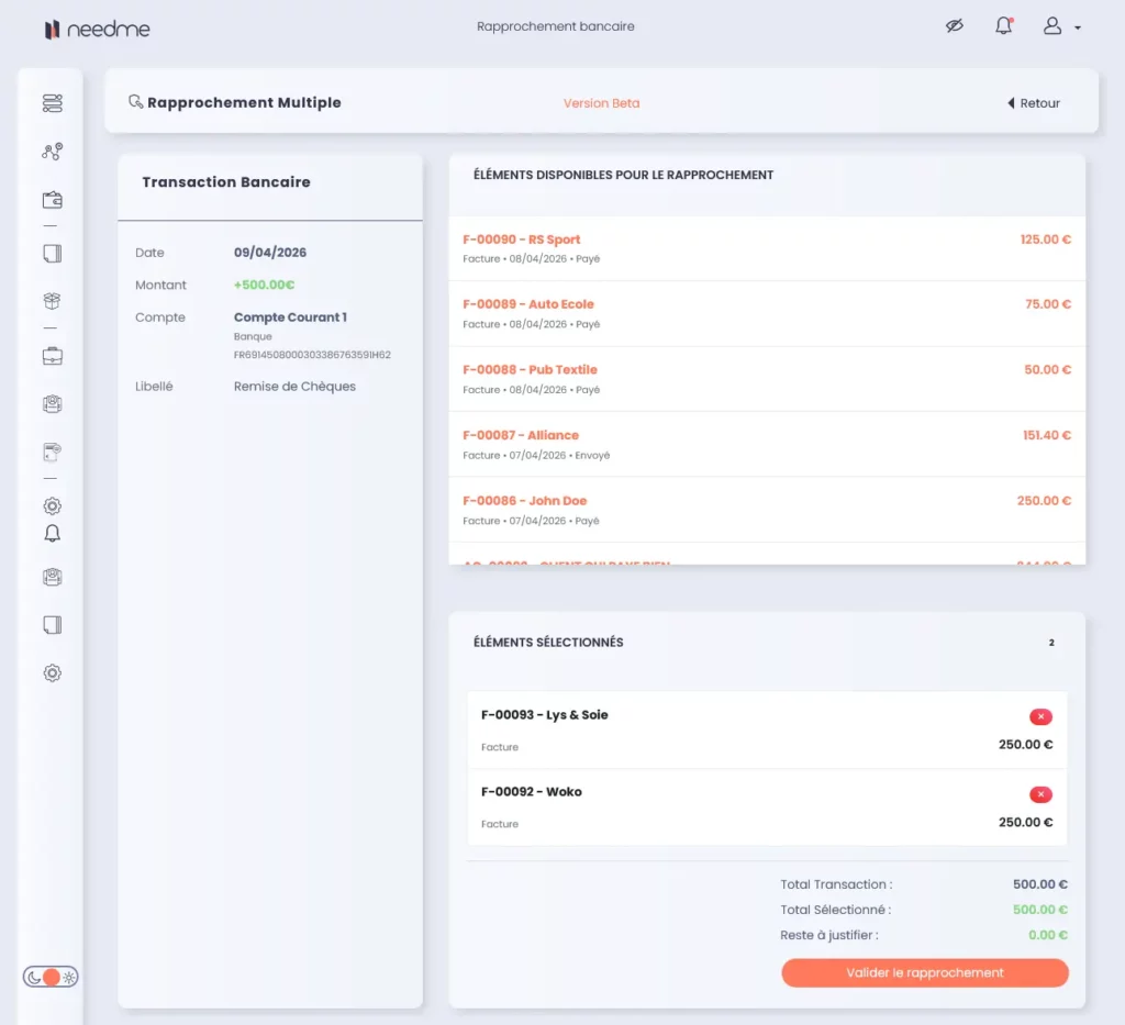 Souvent, votre banque affiche une ligne globale (ex: une remise de chèques de 500 €) alors que vous avez plusieurs factures correspondantes dans NeedMe.