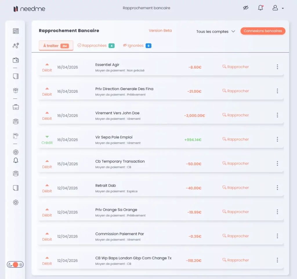 Gérer une micro-entreprise demande de la polyvalence, mais le pointage manuel de vos comptes ne devrait pas vous prendre une minute de plus. Grâce à l’intégration de l’API d’un partenaire agrée, NeedMe vous propose la synchronisation bancaire : un outil intelligent qui fait le pont entre vos transactions réelles et votre comptabilité.