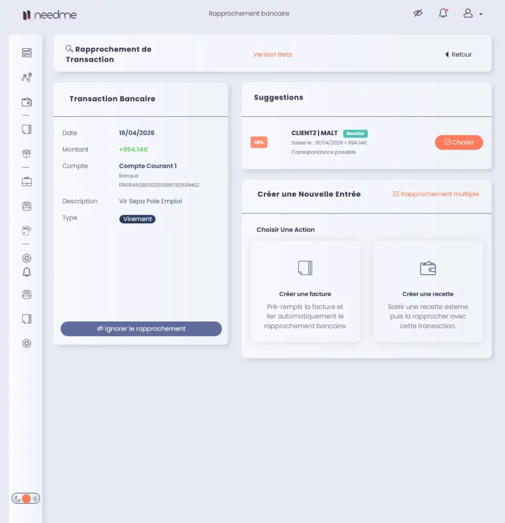 Dans l’onglet À traiter, cliquez sur Rapprocher à droite d’une ligne. NeedMe affiche alors deux colonnes :