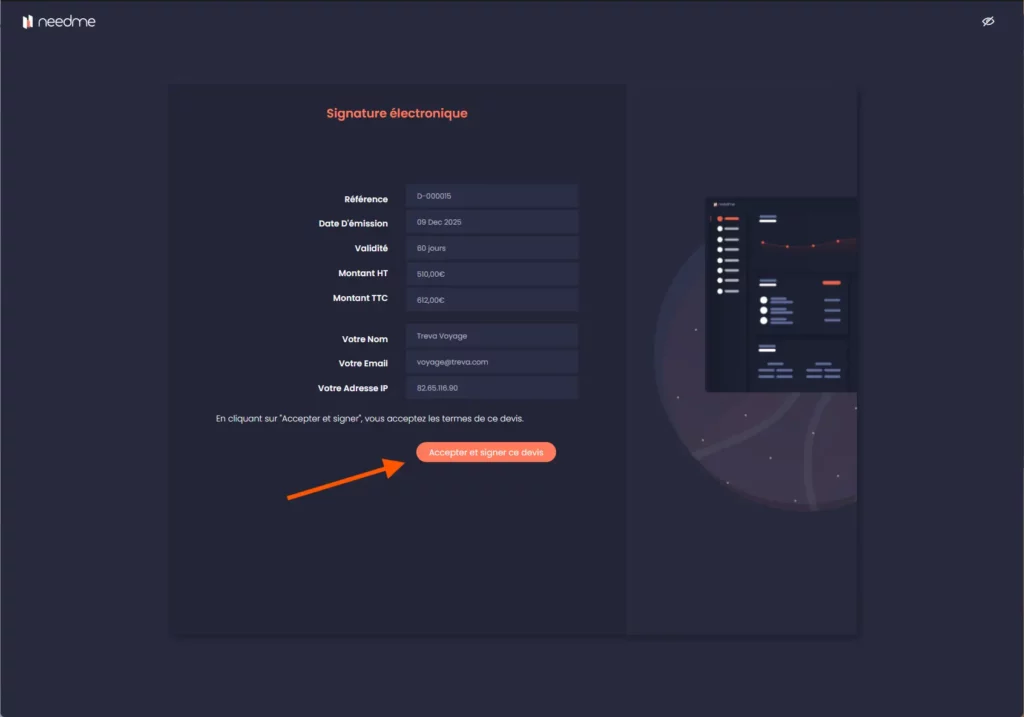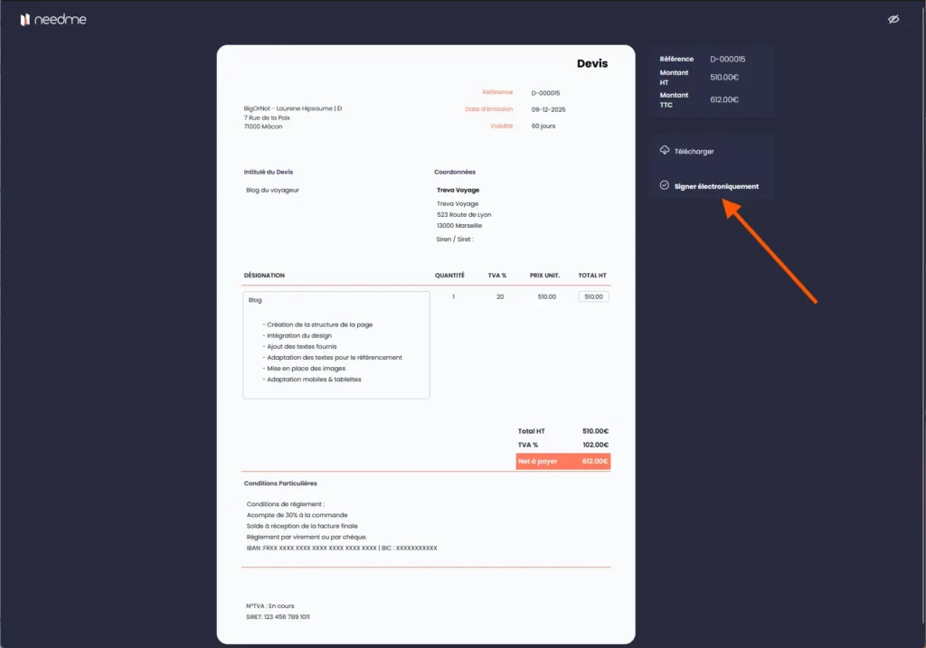 - Envoi par email via NeedMe : votre client reçoit un email contenant un lien de visualisation du devis. Sur cette page, dans la colonne de droite, il voit le bouton “Signer électroniquement”.