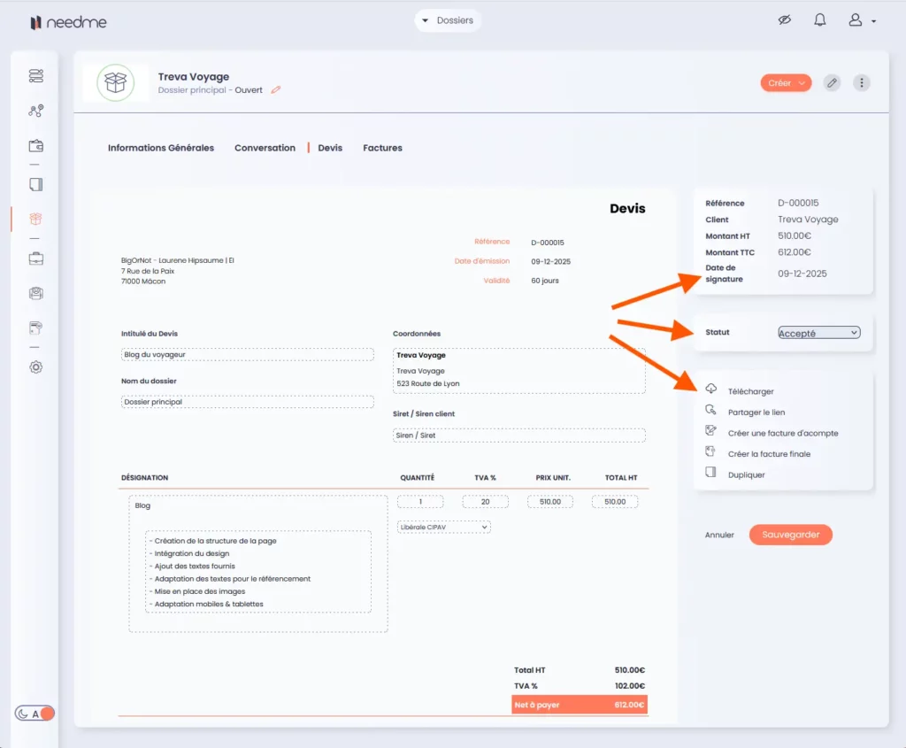 - Vous envoyez ou partagez votre devis depuis NeedMe.