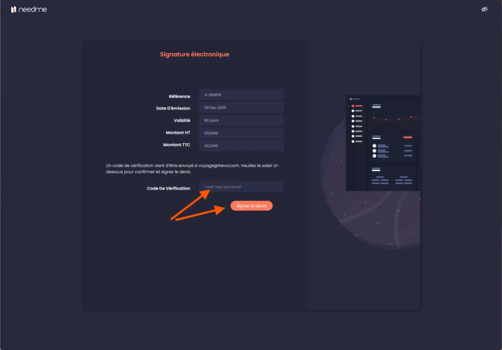 “Un code de vérification vient d’être envoyé à votre adresse email. Veuillez le saisir ci-dessous pour confirmer et signer le devis.”