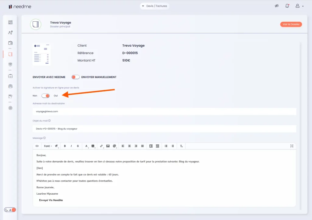 Par défaut, lors de l’envoi d’un devis via NeedMe, l’option de signature électronique est activée. Un bouton switch (Oui / Non) est présent dans la fenêtre d’envoi :