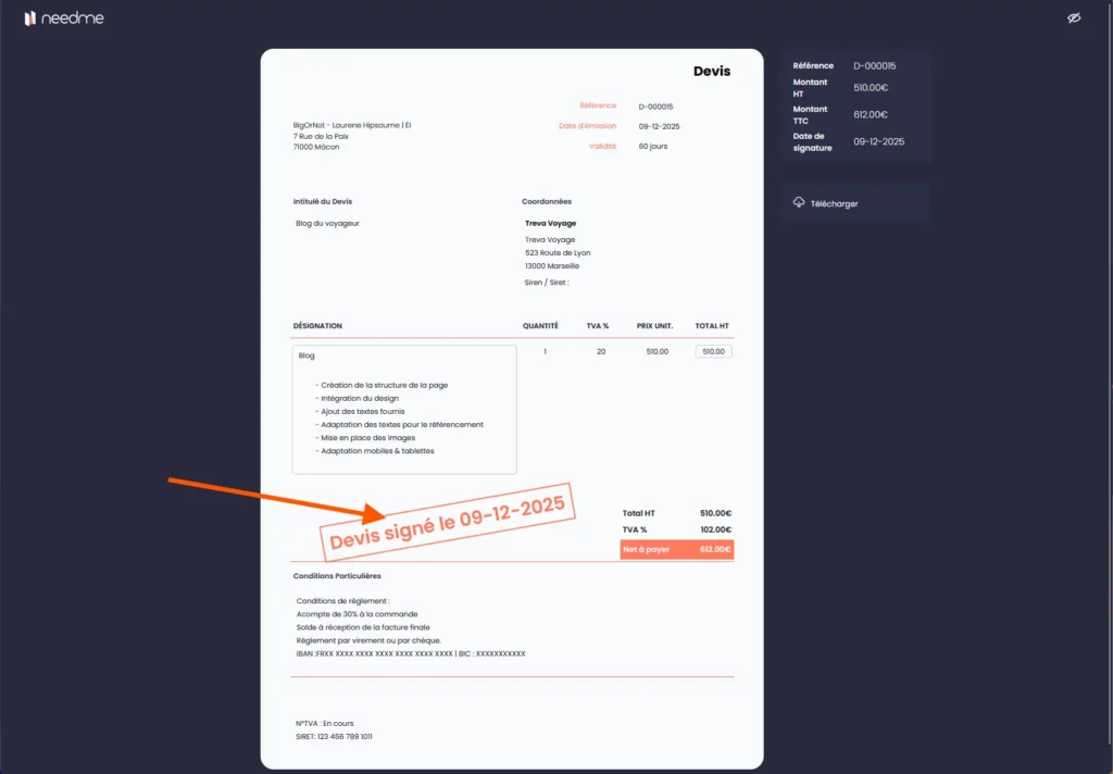 De votre côté, en tant qu’utilisateur NeedMe, vous pouvez aussi télécharger le devis signé au format PDF depuis l’interface. Le tampon de signature y apparaît également en bas du document.